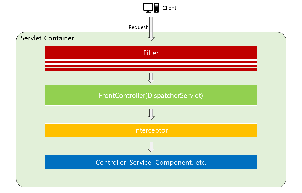 필터는 Web Context에서, 즉 톰캣과 같은 웹 컨테이너(서블릿 컨테이너)에서 관리가 된다. Dispatcher Servlet이 존재하는 Spring Context 즉 스프링 컨테이너에서 관리되지 않는다.