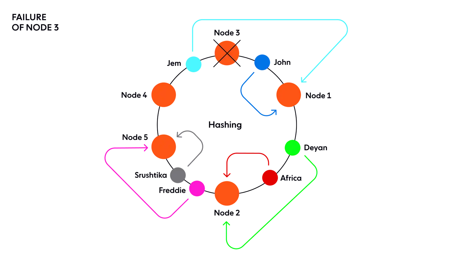 그리고, 1번 노드를 삭제한다면, 균일하게 분포되지 않았기 때문에 John 데이터를 제외한 모든 데이터가 3번 노드 담당이 된다.