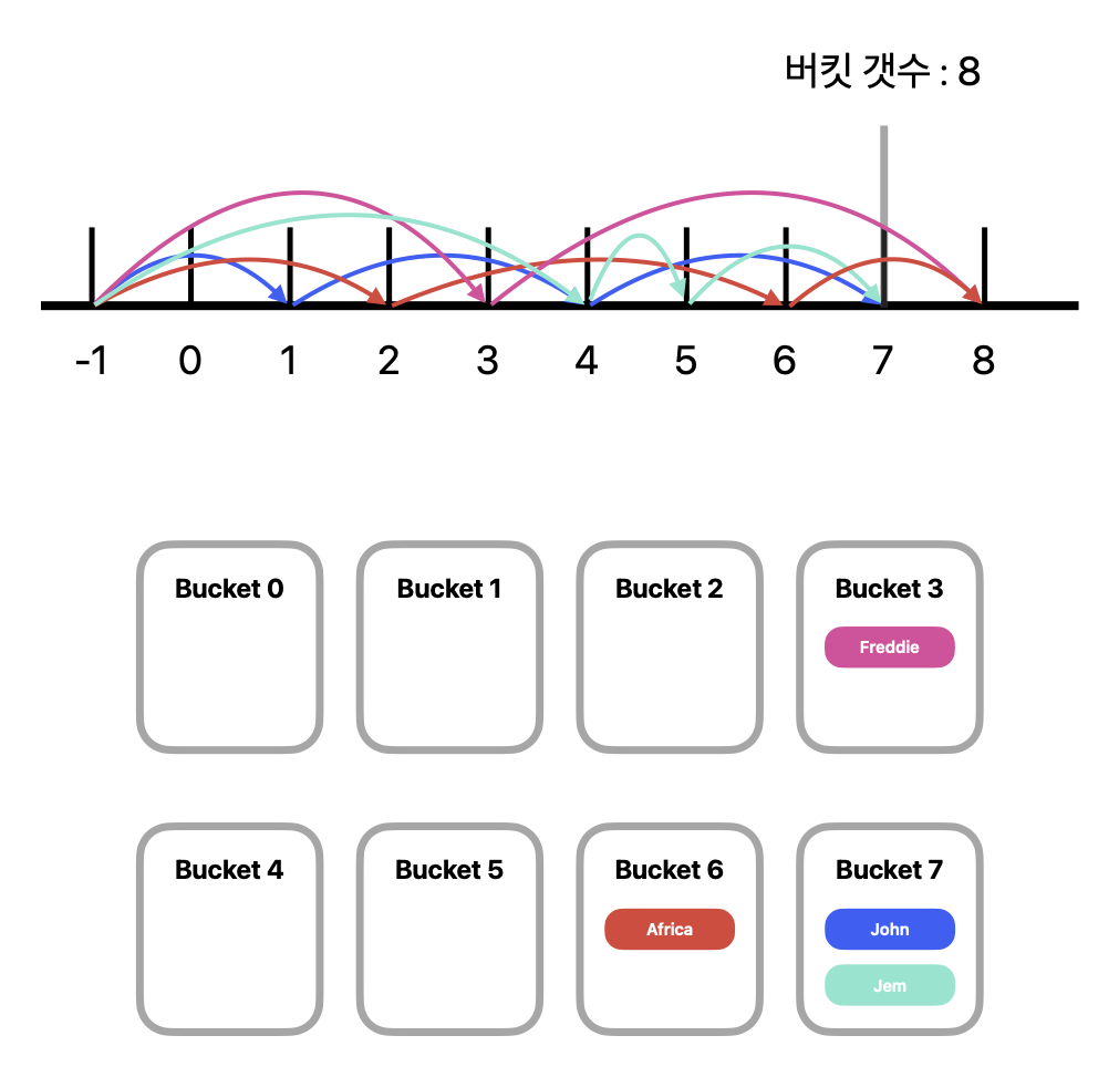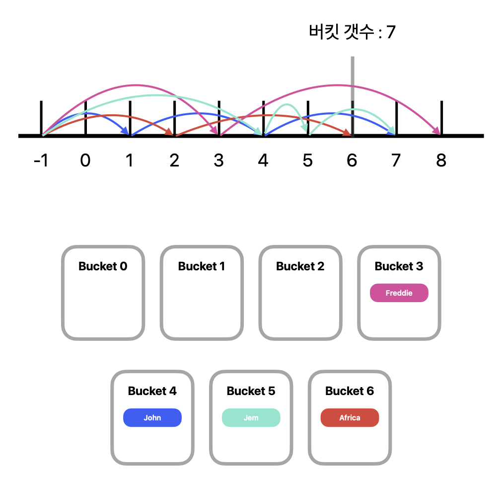 John은 -1 → 1 → 4 → 7 으로 Jump 했기 때문에, 마지막으로 Jump한 4번 버킷에 배치된다.