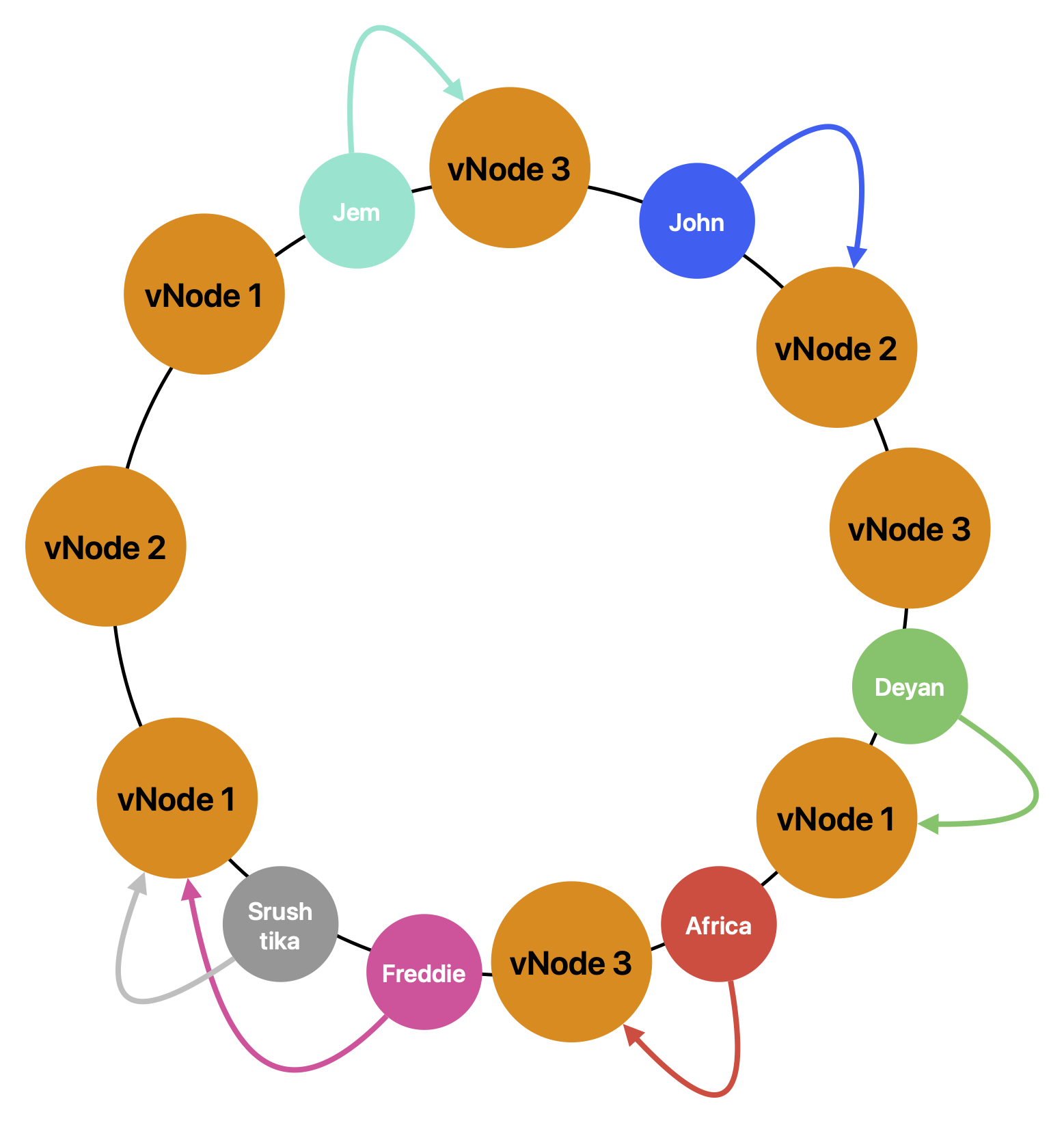 아래는 Consistent Hash의 문제점을 다룬 예제에 vNode를 추가한 예제이다. 곳곳에 가상 노드를 배치함으로서 보다 균일하게 배치되었다.