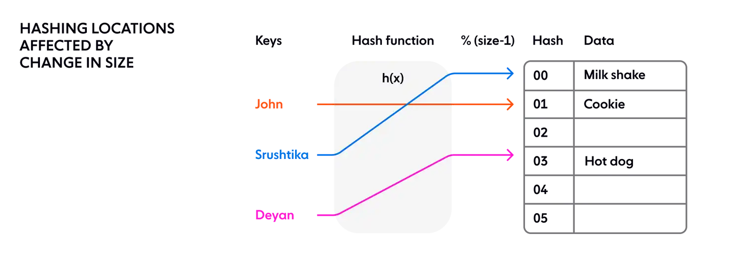 위 이미지에서는 총 크기를 5로 잡았는데, 만약 4로 변경하게 된다면 아래와 같이 많은 데이터가 다른 인덱스를 가져야한다.